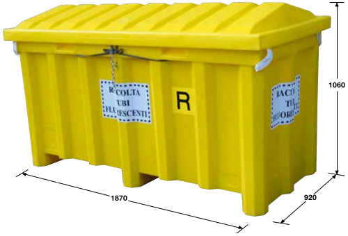 Multipurpose Polyethylene Containers Features These flexible multipurpose containers are sturdy and secure. Ideal for storing waste fluorescent tubes but suitable for a wide range of applications. The bright yellow containers are made of polyethylene with an inner flexible and removable polypropylene bag. The containers have a palletized base allowing them to be easily transported using a forklift truck. The containers are equipped with a hinged lockable lid with a hanger rod that keeps the lid open while loading and unloading. Available as an option is an inner structure that holds four drawers or trays for small materials. An extra inner polypropylene bag can also be purchased from within the options. If you require any additional information or technical details regarding this product please contact us as our staff are at your full disposal. Delivery is FREE to mainland UK, excluding Northern Ireland, Scottish Highlands and Islands. Please call for a delivery price to these regions. Prices do not include VAT. Products not in stock have a 4 week lead time. Multipurpose Container ModelDimensionsCapacity Container 1870x920x1060 900 L Set of 4 Inner Trays 300x400x100 -